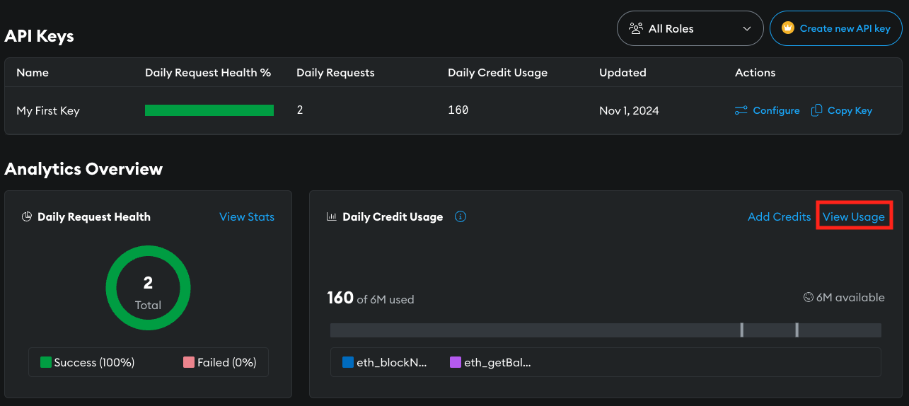 The dashboard provides an overview of your daily credit usage. Select View Usage for a wider view of your credit usage.